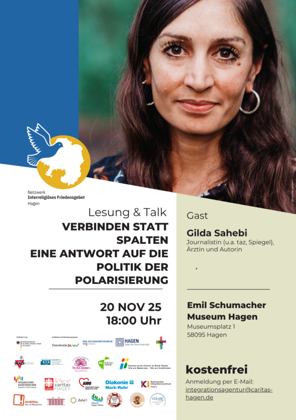 Gilda Sahebis Lesung wird veranstaltet vom Netzwerk Interreligiöses Friedensgebet Hagen. Zum Netzwerk gehören: AllerWeltHaus Hagen, Bahái-Gemeinde in Hagen, Bildungs- und Kulturverein Hagen e.V., Hagen Yun Hwa Dharma Sah, Bund der Deutschen Katholischen Jugend Stadtverband Hagen, CVJM Hagen, Dekanat Hagen-Witten, Ev. Kirchenkreis Hagen, Freiwillige Hände e.V., Gesellschaft für Christlich-Jüdische Zusammenarbeit Hagen und Umgebung, Hellenistisch-Orthodoxe Mission Deutschlands "Der Evangelist Markos" e.V., Integrationsagenturen der AWO UB Hagen - Märkischer Kreis, der Caritas Hagen und der Diakonie Mark- Ruhr, Kommunales Integrationszentrum Hagen, Pastoralraum Hagen-Mitte (West), Volme Kulturforum und das Emil Schumacher Museum Hagen.