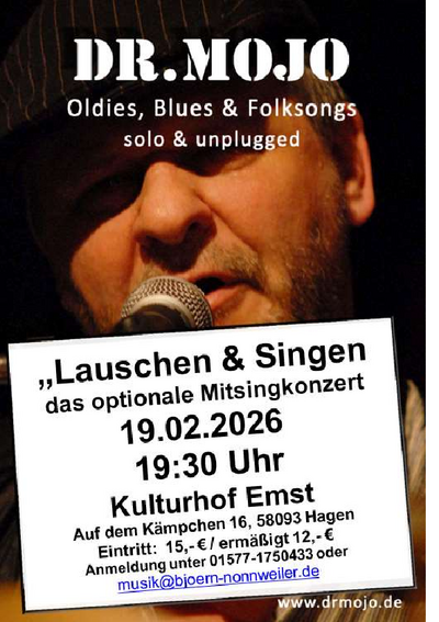 “Lauschen und Singen” - zu einem optionalen Mitsing-Konzert lädt Dr. Mojo in den AWO Kulturhof auf Emst.