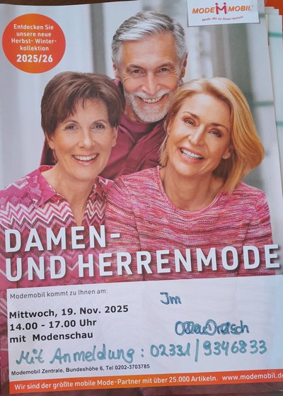 Damen- und Herrenmode aus der aktuellen Herbst-Winter-Kollektion präsentiert das „Modemobil“ in der AWO-Begegnungsstätte Eventcafé Oller Dreisch (Eugen-Richter-Str. 21, 58089 Hagen).
